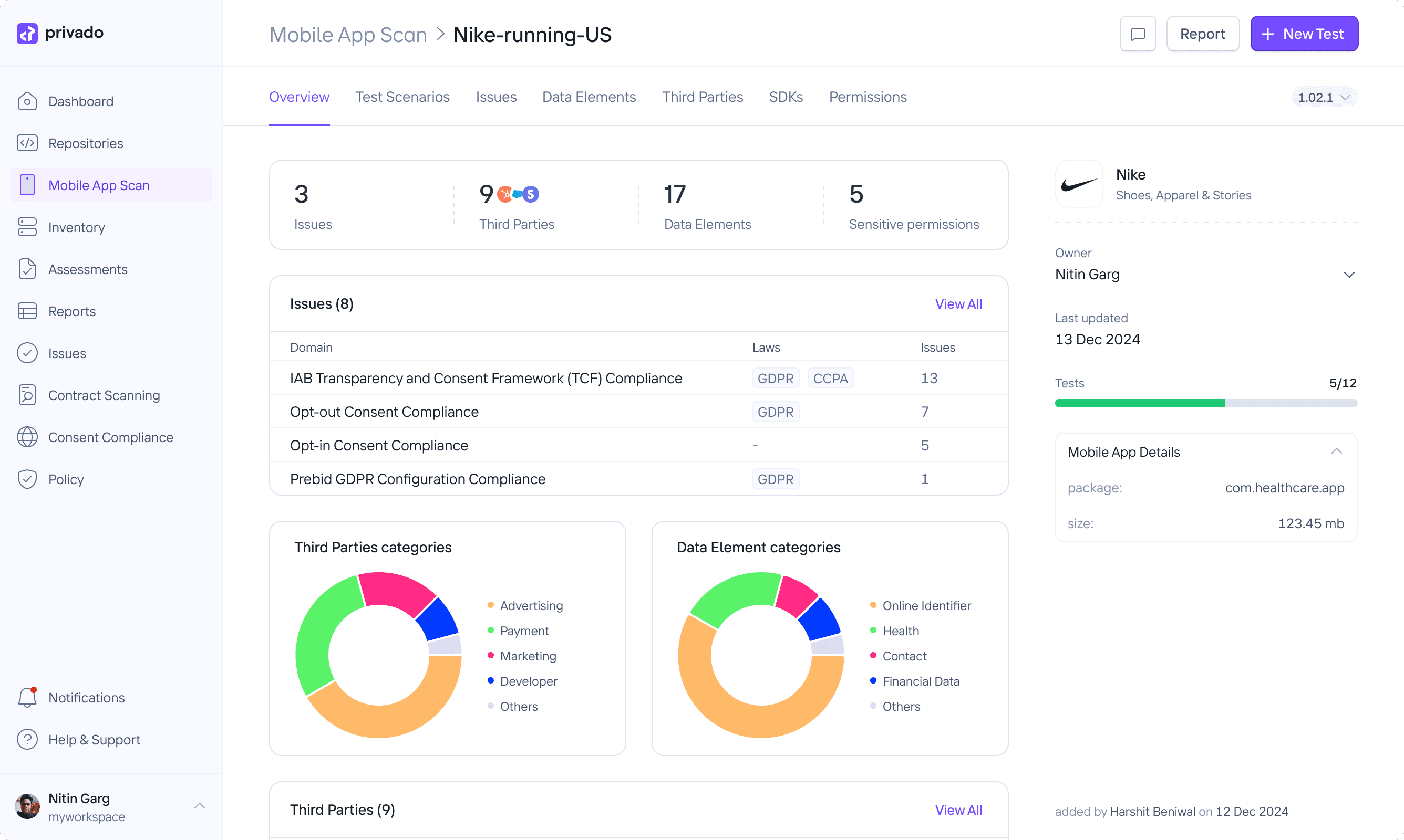 To assist privacy officers in understanding this complexity, we created an overview of all findings related to an app. Giving them a birds-eye view of the third parties sharing, data elements compromised and issues created by Privado Mobile App scan.