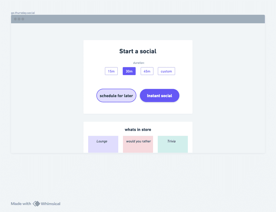 Thursday was designed so that you can start easily with one click or customize it endlessly to suit your team's needs. To reduce any friction, we even allowed hosts to start without signing up. Hosts could schedule socials to their calendars, have new activities scheduled automatically using templates, and share them with the whole team using our Slack bot, reliving their best memories.