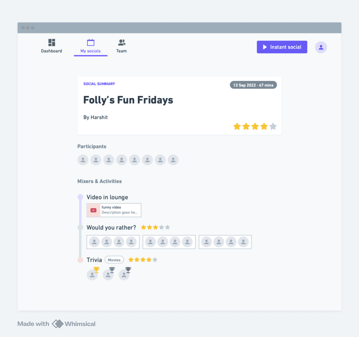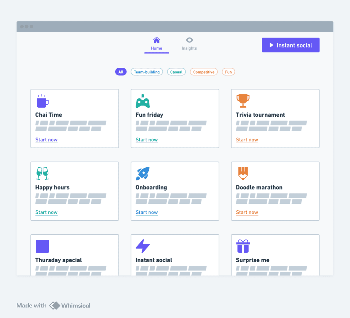 With these three elements: Lounge for meeting in larger groups, Mixers for engaging in varied activities with their coworkers, and a Dashboard where hosts could customize and schedule socials with host, we made it easier for everyone to focus on what matters—engaging with their teammates.