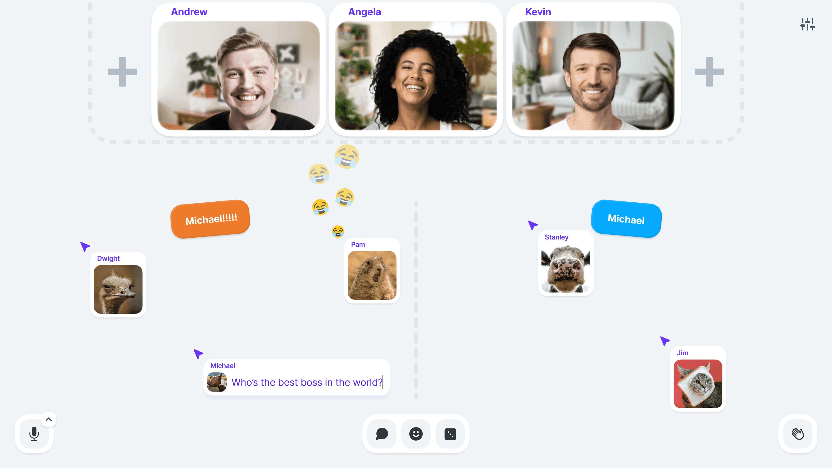 Lounge is an assembly space in Thursday. Think of it like, well, lounge in your office. It is where people gather, and do things together. Lounge is spatial, like a room. When you move your cursor, you move as well. creating a dynamic space where everyone's presence is felt.